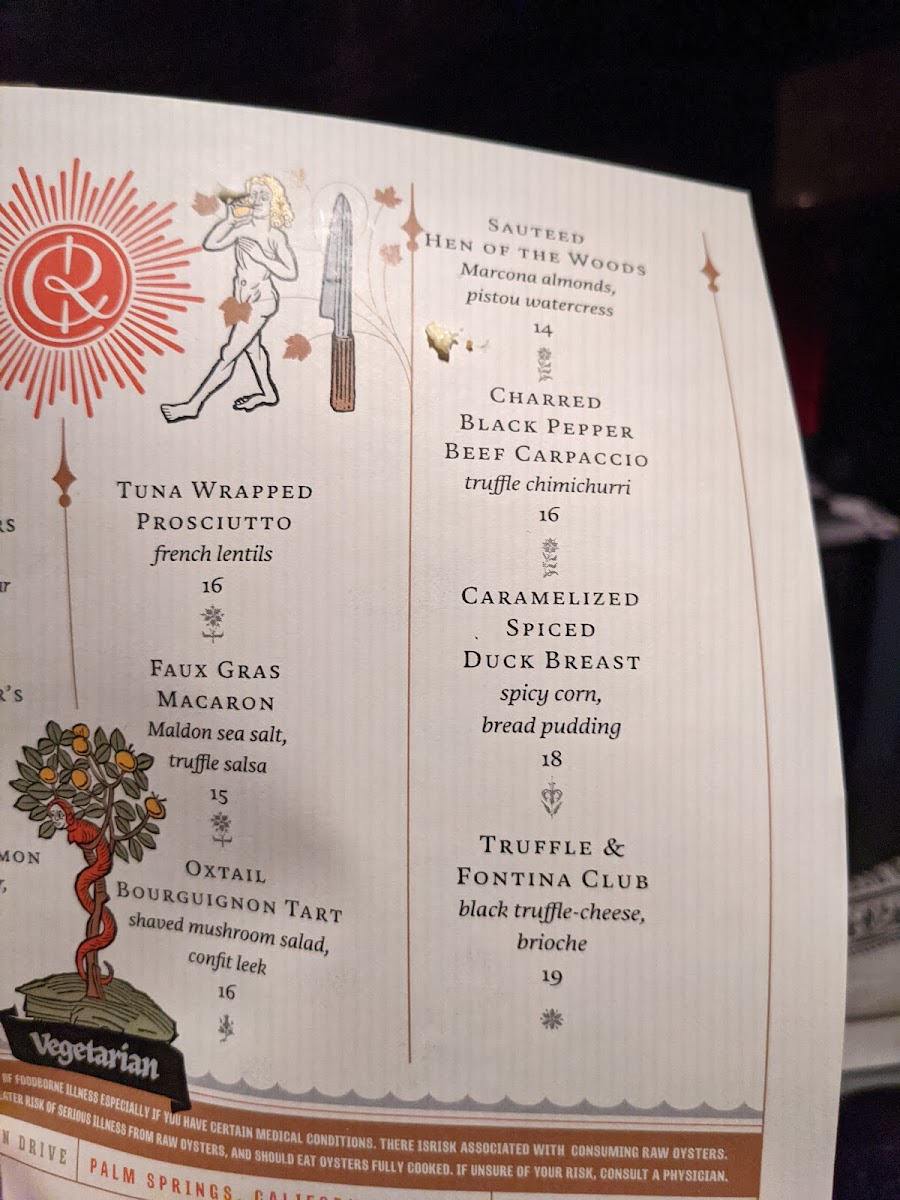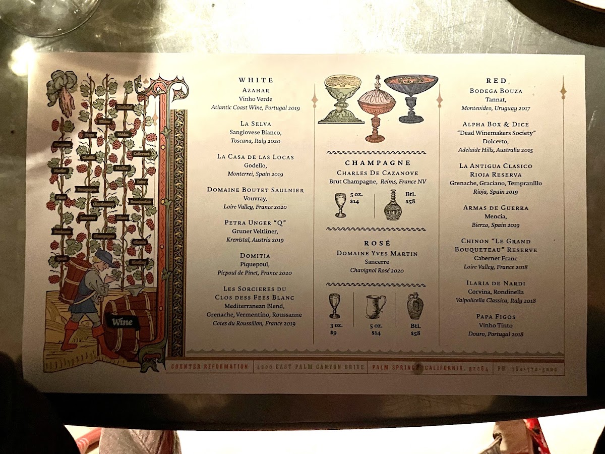 Welcome to Counter Reformation, an enchanting wine bar nestled within the Parker Hotel in Palm Springs. This hidden gem captivates guests with a carefully curated menu that emphasizes small bites and impressive wine pairings. Revel in delightful dishes like the succulent beef carpaccio with pickled cauliflower and truffle, or indulge in the luxurious quail eggs with caviar. The ambiance exudes warmth and sophistication, perfect for a romantic evening or friendly gathering.